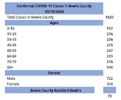 Bowie County Emergency Operations Center reports 86 new cases since Thursday, October 15, 2020 for a total of 1,653 positive COVID-19 cases, with 75 deaths. The Department of State Health Services is reporting 1,148 recoveries.