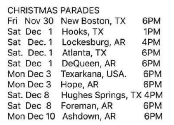 We got a Facebook message with a list of some of the area Christmas Parades dates and times… and old Santa has a lot of hand waving coming up in the region.