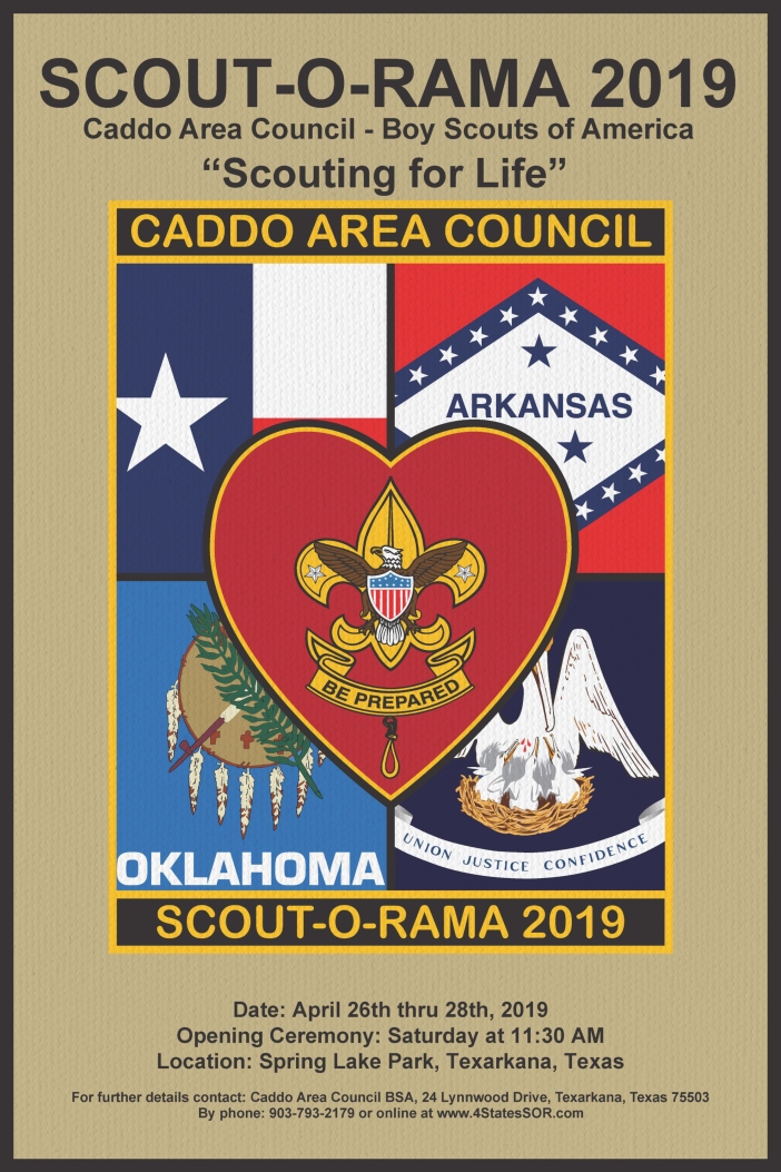 Scout-O-Rama 2019 returns to Spring Lake Park in Texarkana, Texas the weekend of April 26 – 28 for Boy Scouts of America units all over the Four States area and beyond. It’s time to register your Scouting unit if you’re planning on being there for all the fun this year. Unit registration is free and available online at 4statesSOR.com/registration through March 20. After that, there will be a $25 late registration fee for units camping with us. T-Shirt and patch orders must be in the Scout Service Center no later than April 12 by 5 PM.