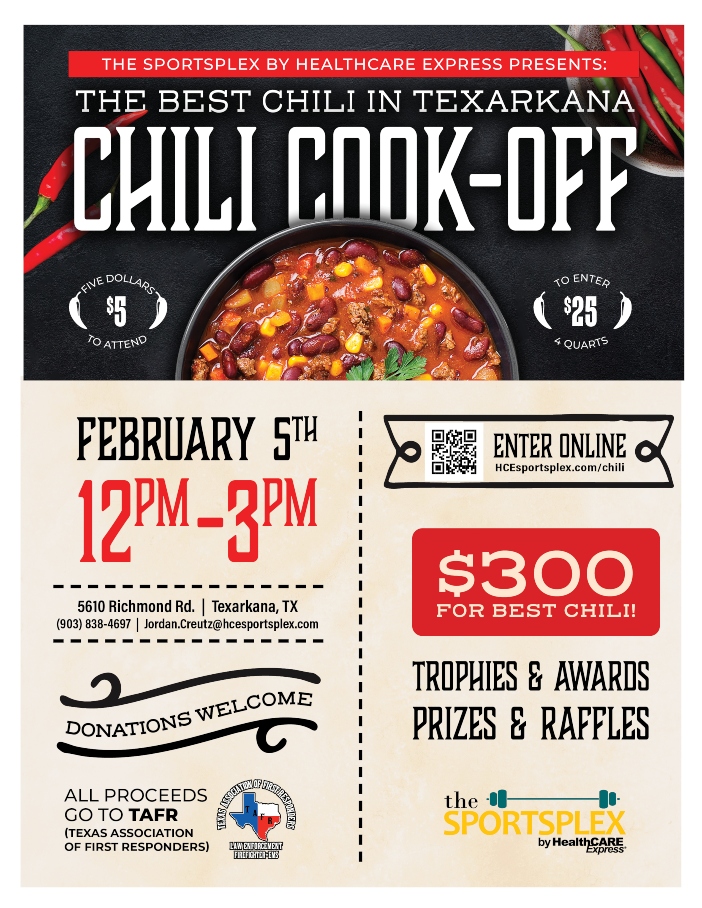 “The Best Chili in Texarkana cookoff is a fun afternoon of food, community, and a healthy dose of competition,” said Jordan Creutz of the Sportsplex. “We aim to host at least 20 contestants to serve their prized chili recipes to our judges and taste testers and compete for a $300 grand prize.”