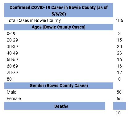TEXARKANA, TX—Bowie County Emergency Operations Center reports a total of 105 positive COVID-19 cases, with 68 recoveries and ten related deaths. Cass County has a total of 19 with 13 recovered.