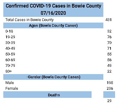 TEXARKANA, TX— Bowie County Emergency Operations Center reports a total of 431 positive COVID-19 cases, with 187 recoveries and 29 deaths. There are currently 215 active cases being traced in Bowie County.