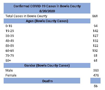 TEXAKANA, TX— Bowie County Emergency Operations Center reports a total of 861 positive COVID-19 cases, with 410 recoveries and 56 deaths. There are currently 395 active cases being traced in Bowie County.