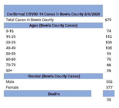 TEXARKANA, TX— Bowie County Emergency Operations Center reports a total of 679 positive COVID-19 cases, with 291 recoveries and 38 deaths. There are currently 350 active cases being traced in Bowie County.