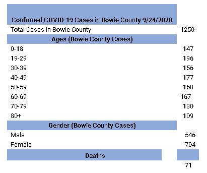 TEXARKANA, TX— Bowie County Emergency Operations Center reports 74 new cases since Monday, September 21, 2020 for a total of 1,250 positive COVID-19 cases, with 683 recoveries and 71 deaths. There are currently 496 active cases in Bowie County.