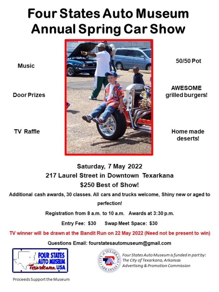 On Saturday, May 7, at the Four States Auto Museum in downtown Texarkana it is the Annual Car Show for everybody. All cars and trucks are welcome, from the brand spankin’ new to those aged to perfection.