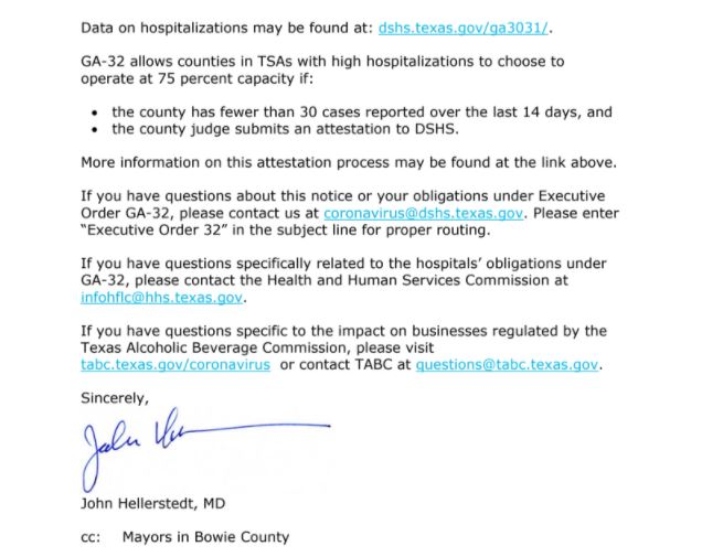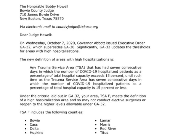 TEXARKANA, TX—Bowie County Judge Bobby Howell received notification Saturday, January 2, 2020 from Dr. John Hellerstedt, Commissioner of Texas Department of State Health Services, notifying him that COVID-19 hospitalizations in Trauma Service Area F have exceeded 15% of capacity for at least seven consecutive days.