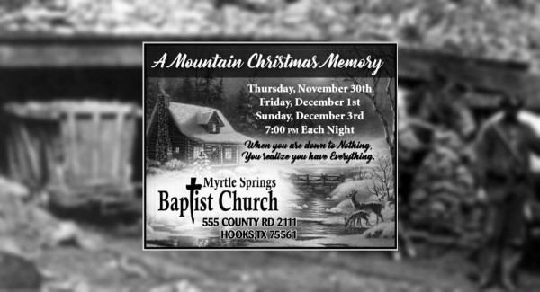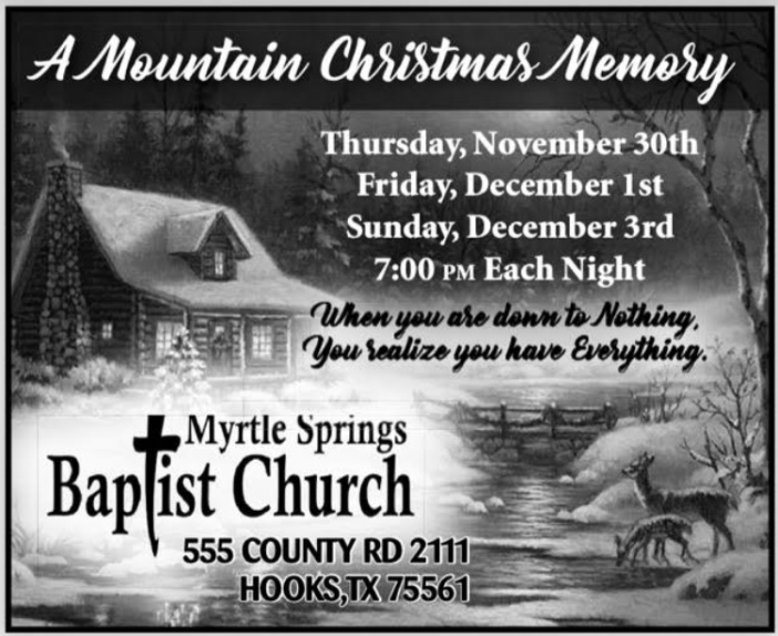 Celebrate the true meaning of Christmas with this special presentation of “A Mountain Memory Christmas” from the Choir & Drama team at Myrtle Springs Baptist Church in Hooks Texas. There will be three performances to kick off the Christmas season, and all are free to the public.