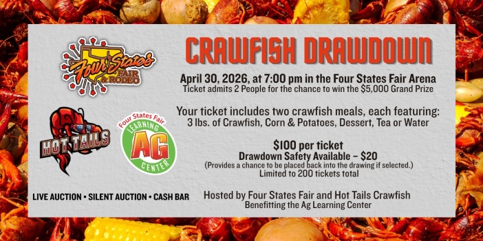 The Four States Crawfish Drawdown is set for Thursday, April 30 at 7:00 p.m. inside the Four States Fairgrounds Arena. The event is presented by the Four States Fair & Rodeo Association in partnership with Hot Tails Crawfish.