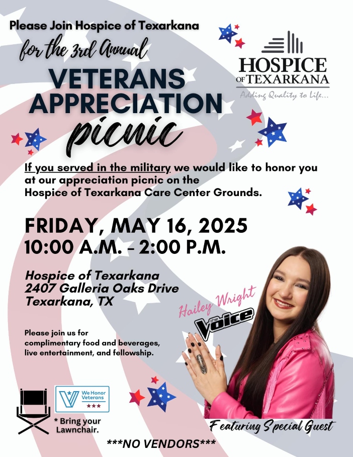 Local veterans are invited to enjoy a day of honor, fellowship, and celebration at the 3rd Annual Veterans Appreciation Picnic, hosted by Hospice of Texarkana on Friday, May 16, from 10 a.m. to 2 p.m.