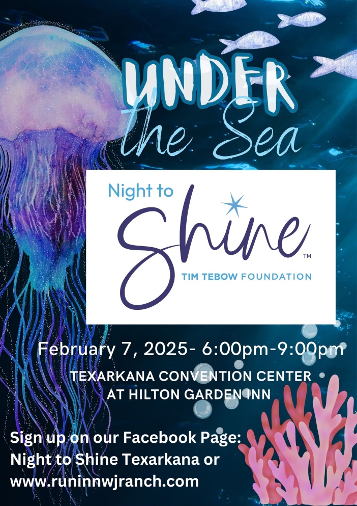 Get ready for a magical evening of fun, laughter, and unforgettable memories at the Under the Sea Night to Shine Prom, set for Friday, February 7th, 2025, at the Texarkana Texas Convention Center. This special event celebrates individuals with special needs and their caregivers, offering an evening of dancing, joy, and love, where every guest is treated like Queens and Kings!