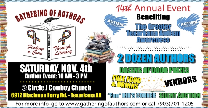 The Gathering of Authors event is not just a book fair; it’s a community effort to make a positive impact on the lives of autistic children through Greater Texarkana Autism Awareness. Come out, bring a friend, and immerse yourself in a day of literary enjoyment, entertainment for kids, and the chance to win exciting prizes. By being a part of this event, you can make a difference in the lives of those who need it most. So, mark your calendars, gather your loved ones, and join us at the Gathering of Authors – where literacy and compassion come together to create something truly beautiful. SEE YOU THERE!