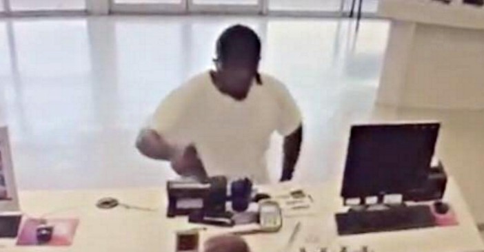 The suspect is described as a black male, approximately 220 lbs., 5’9″, with a goatee, wearing a white t-shirt, black shorts, and a black do-rag.