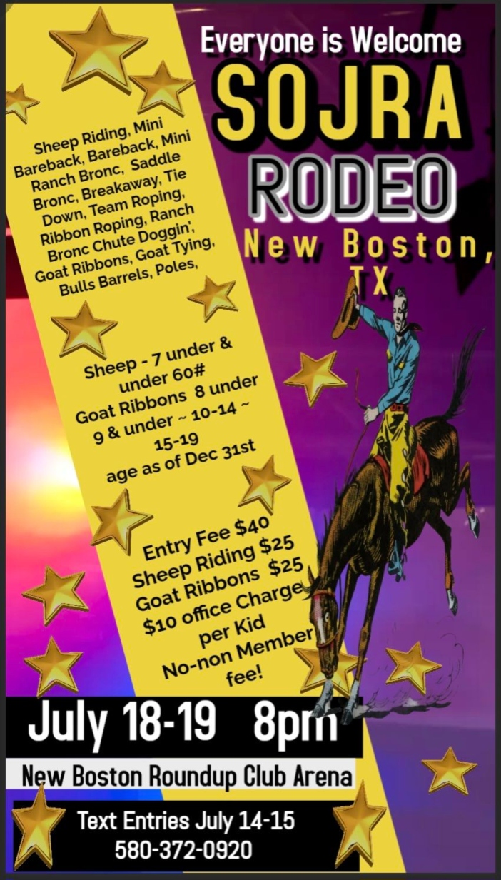 It’s rodeo time in New Boston, and the whole community is invited to join the action! The New Boston Round Up Club is proud to host the Southeast Oklahoma Junior Rodeo Association (SOJRA) Rodeo on Friday and Saturday, July 18–19, 2025 at the New Boston Round Up Club Arena, located at 1154 Daniels Chapel Road.