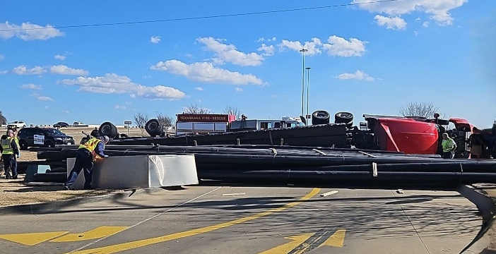 According to reports, the truck’s load shifted as the driver attempted to navigate the turnaround, leading to the truck and trailer tipping over. Large pipes spilled from the trailer, rolling toward the side entrance of Raising Cane’s Chicken Restaurant. Fortunately, no vehicles, buildings, or pedestrians were damaged.
