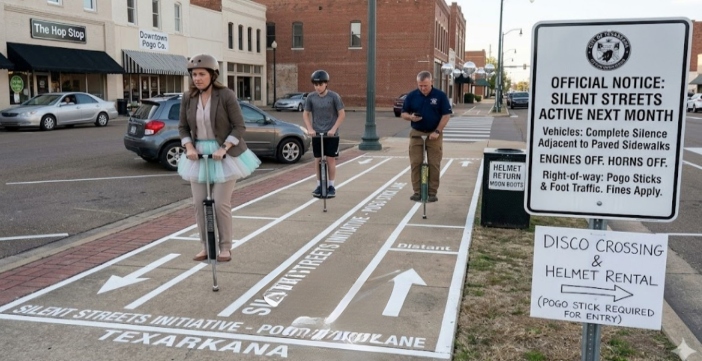Texarkana, TX — April 1, 2026 – In a bold new step for city infrastructure, the City of Texarkana announced today that it will be implementing “Silent Streets” starting next month, a follow-up to its ongoing sidewalk improvement program. The initiative will require all vehicles driving on streets adjacent to newly paved sidewalks to operate in complete silence — engines, horns, and even car stereos must be off. Pedestrians, joggers, and cyclists will have full right-of-way.