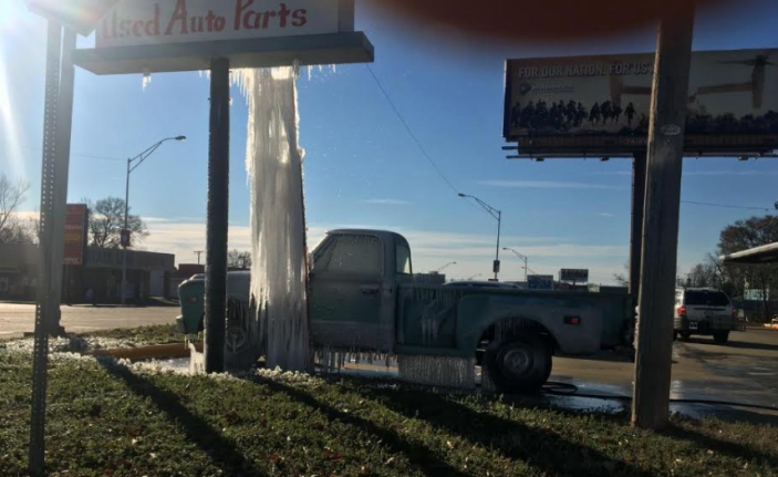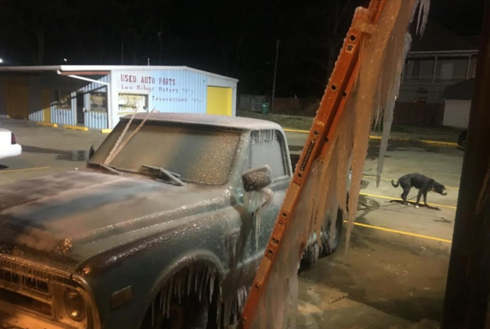 He called me last night telling me he was making popsicles for the kids and to bring them to his shop. I laughed bc he is always coming up with something silly. He ‘setup’ his popsicle maker by stretching his water hose across his parking lot and up the ladder to spray water on his sign. Some of his popsicles are 16ft! He has had people stopping and turning around to take pics of his ice. He has had many calls to make him aware of his water leak. lol. He is my dad and a great silly Paw Paw just wanting to entertain his grandkids. He will keep adding to it as longs as it freezes up.
