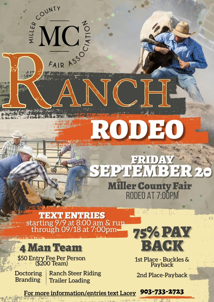 Get ready for a thrilling night of rodeo action at the Miller County Fairgrounds on Friday, September 20th! The highly anticipated Ranch Rodeo will kick off at 7:00 PM, bringing adrenaline-pumping excitement as 4-man teams go head-to-head in a series of classic ranch events.