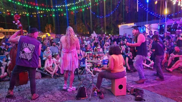 The band features Tara Miller (trash can percussion & vocals), Alex Schultz (guitar & vocals), Mack Dart (fiddle & vocals), Brian “Papa” Briseño (banjo), and Sasha Sonnier (bass & vocals).