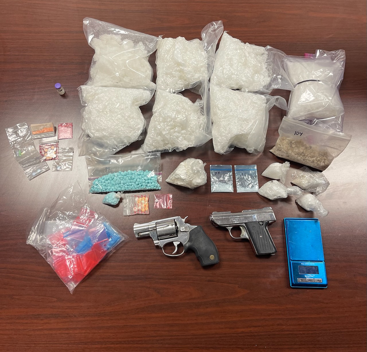 During the search warrant, investigators located 3,391 grams (approximately 7.3 pounds) of suspected methamphetamine, 76.6 grams of suspected cocaine, 71.2 grams of suspected Fentanyl, 8.3 grams of Alprazolam/Clonazepam, 1 LSD tab, and two firearms (one stolen).