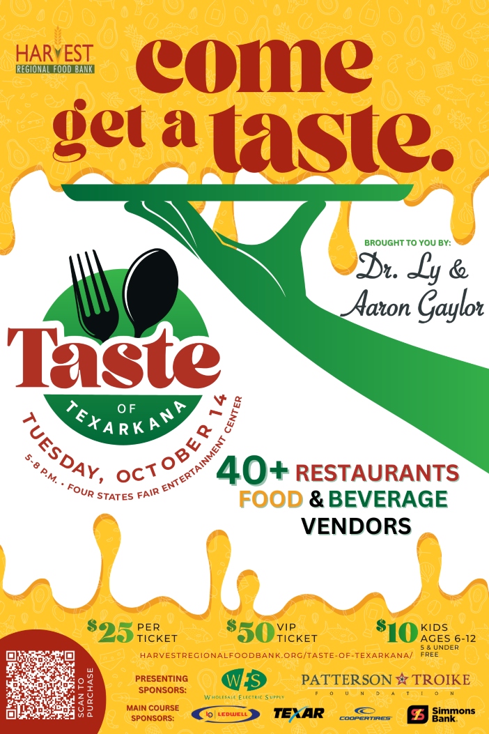 “Taste of Texarkana has been one of the area’s favorite charity events for over three decades,” said Camille Coker Wrinkle, Executive Director of Harvest Regional Food Bank. “Thanks to our generous sponsors and community support, everyone is able to come together for a family-friendly night of fun and great food, all while supporting our mission to end hunger across southwest Arkansas and northeast Texas.”