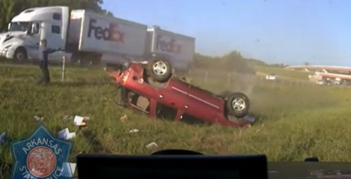 The suspect accelerated to approximately 95 mph after turning onto Interstate 30. Near the I-30/I-49 interchange, he attempted to maneuver around another vehicle but lost control, causing his car to overturn in the median.