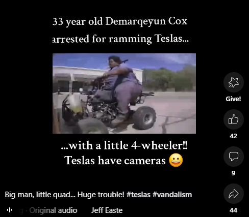 According to TTPD, Cox allegedly damaged a total of three Tesla vehicles. In addition to the ramming incident, authorities say he used a tool to scratch the word “Elon” into the paint of the other two vehicles.