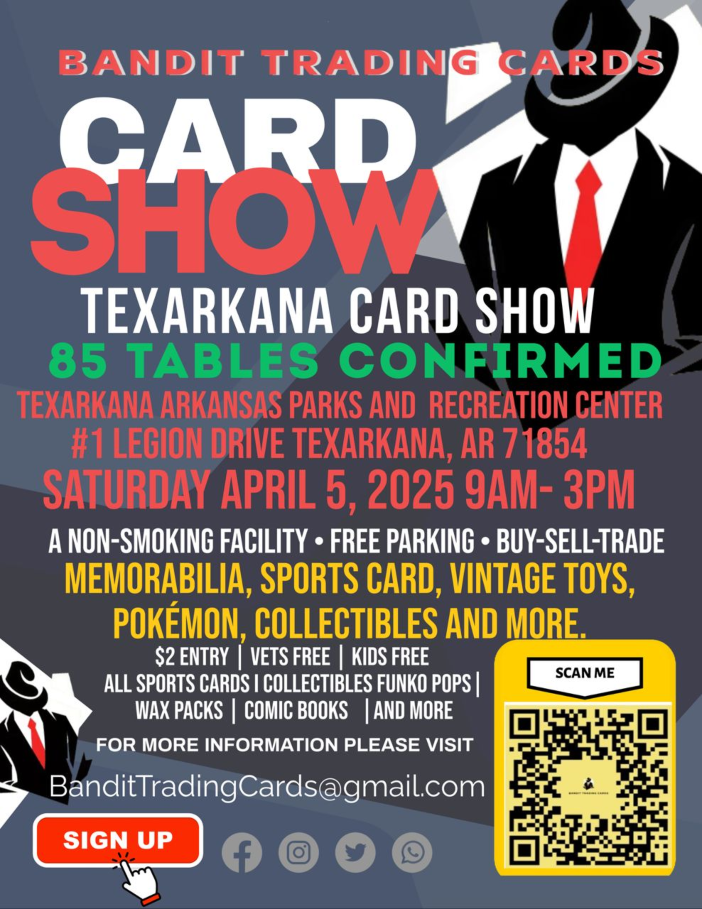 Collectors and hobbyists, get ready! The Texarkana Card Show, hosted by Bandit Trading Cards, is set for this Saturday, April 5, at the Texarkana Arkansas Parks & Recreation Center, located at #1 Legion Drive. Doors open at 9 a.m., and the event runs until 3 p.m.