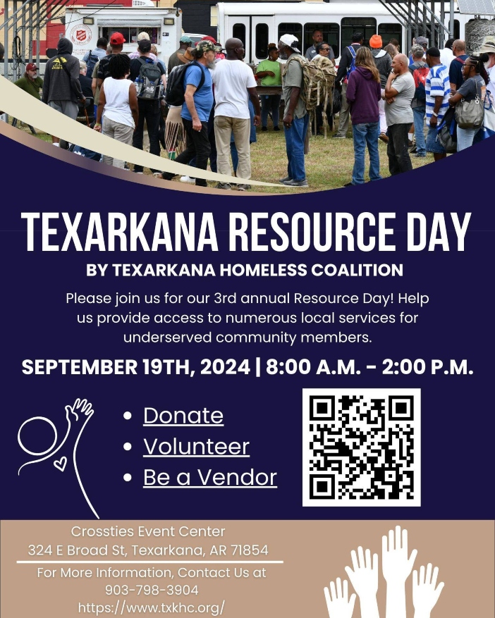 The Texarkana Homeless Coalition (TXKHC) will hold its 3rd Annual Resource Day on Thursday, September 19, 2024, from 8:00 a.m. to 2:00 p.m. The event will take place on the lawn of Crossties Event Venue at 324 East Broad Street in Texarkana, AR.