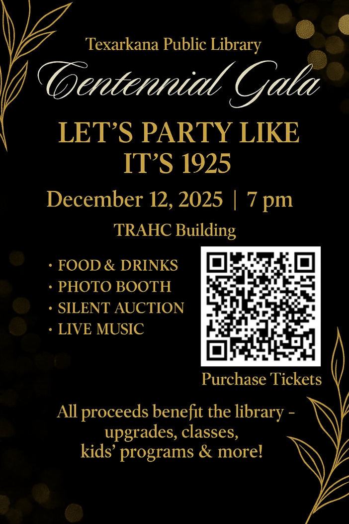 The evening will honor 100 years of literacy, learning, and cultural enrichment in Texarkana. Guests can expect a warm, festive atmosphere featuring delicious food, lively entertainment, and plenty of opportunities to reconnect with friends, neighbors, and community leaders.
