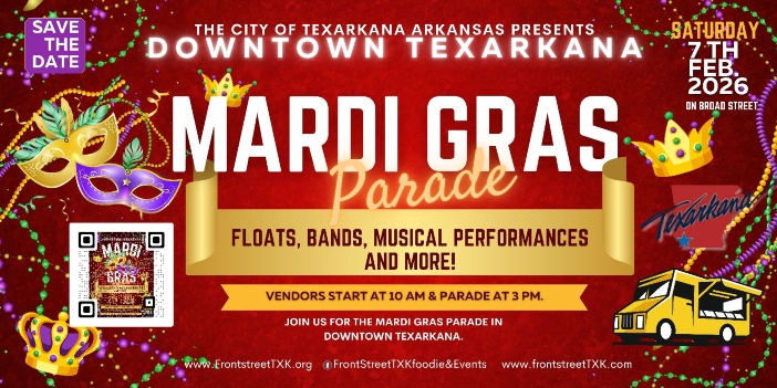 Texarkana is preparing to let the good times roll as Mardi Gras 2026 takes over downtown Texarkana on Saturday, February 7, 2026, bringing a full day of music, food, parade excitement, and New Orleans–style energy to the community.