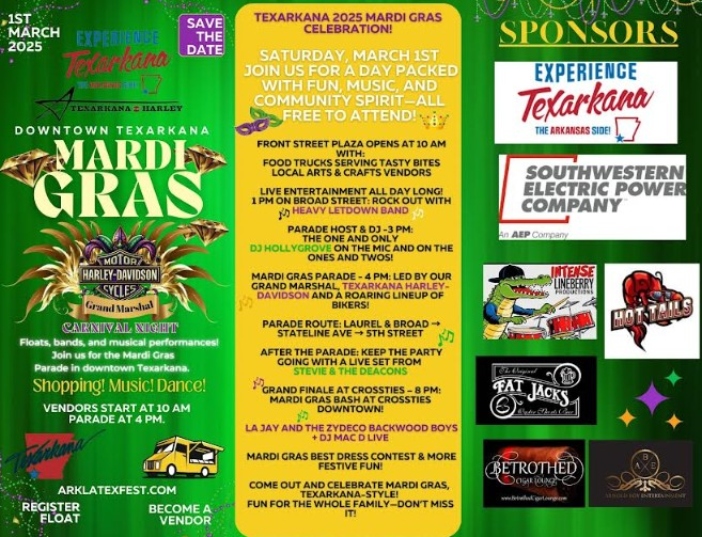 Get ready to let the good times roll as Texarkana gears up for its 2025 Mardi Gras Celebration, “Beads on Broad,” set to take place on Saturday, March 1st. This free, family-friendly event promises a full day of festivities, bringing the community together with live entertainment, food trucks, vendors, and an exciting parade led by Texarkana Harley-Davidson riders.