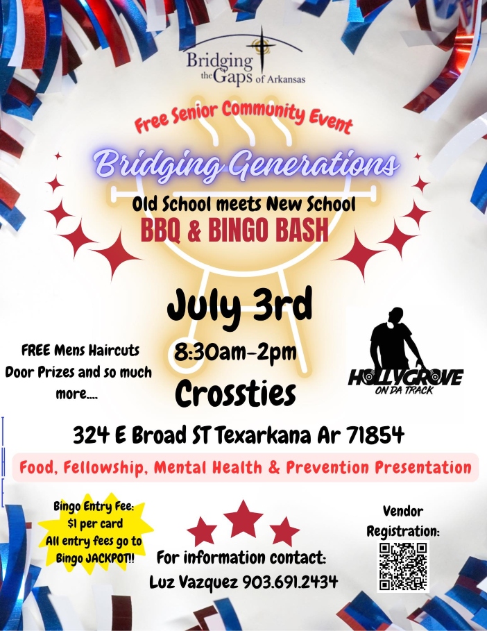A day of fun, food, and fellowship is set for Thursday, July 3, as the community comes together for the Bridging Generations: Old School Meets New School BBQ & Bingo Bash. The event will be held from 8:00 a.m. to 2:00 p.m. at the Crossties Event Center in downtown Texarkana, Arkansas.