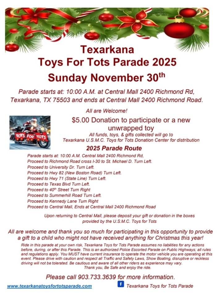 One of Texarkana’s longest-running holiday traditions returns on Sunday, November 30, as the Texarkana Toys for Tots Parade 2025 rolls out to bring cheer, toys, and community spirit to local children. The parade begins at 10:00 a.m. at Central Mall, 2400 Richmond Road, and will follow a large citywide route before returning to the mall for gift drop-offs.