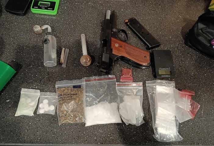 According to the report, officers found a backpack containing a black zipper case with 54.5 grams of suspected methamphetamine, 21 Clonazepam tablets, half of a Xanax bar, 22.4 grams of suspected marijuana including THC gummies, and 8.2 grams of Sildenafil Citrate (generic Viagra). Also recovered were two additional glass meth pipes, a digital scale, and multiple small plastic baggies commonly used for packaging narcotics.