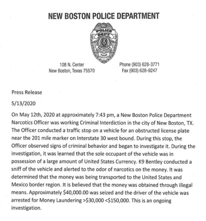 Police in New Boston, Texas have arrested a man after a traffic stop and charged him with money laundering after K9 Officer Bentley alerted to the smell of narcotics in the vehicle. Police discovered and seized approximately $40,000. It is believed the money was being transported to the U.S./Mexico border area.