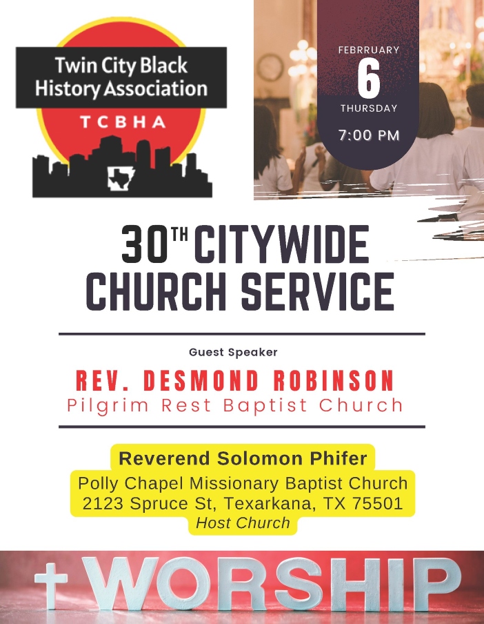 The Twin City Black History Association will mark a significant milestone as it hosts the 30th Annual Citywide Church Service on Thursday, February 6, at 7:00 p.m. The service will take place at Polly Chapel Missionary Baptist Church, located at 2123 Spruce Street in Texarkana, Texas.