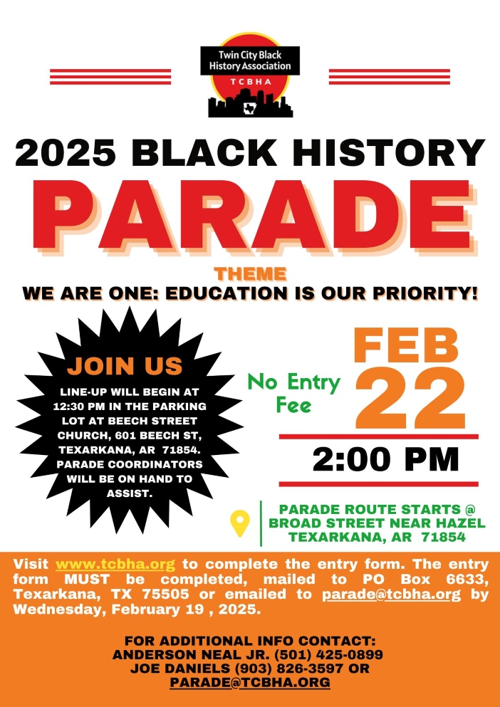 The Twin City Black History Association (TCBHA) is set to celebrate Black History Month with its annual Black History Parade on Saturday, February 22, 2025, in downtown Texarkana. This year’s theme, “We Are One, Education is Our Priority!”, highlights the importance of unity and learning in the community.