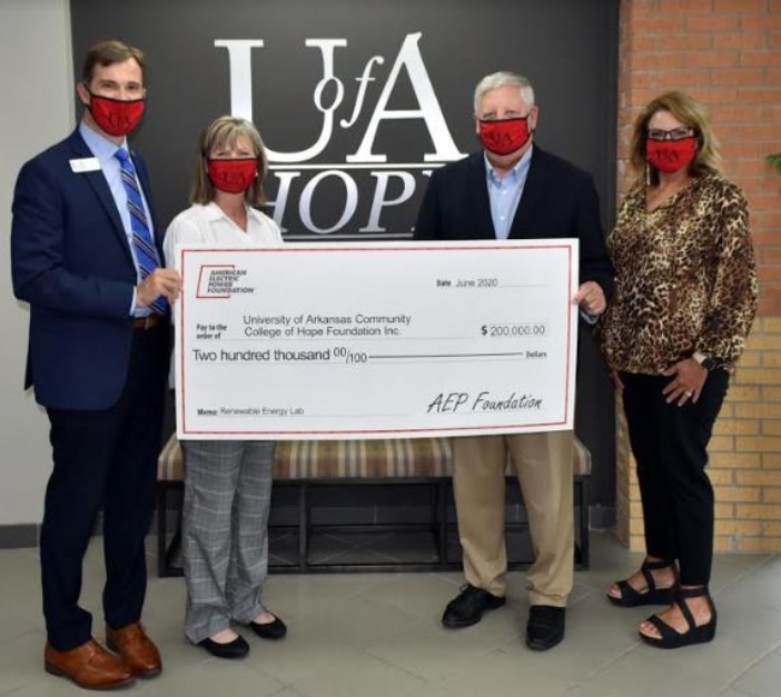 The University of Arkansas Hope-Texarkana received a $200,000 grant from the American Electric Power (AEP) Foundation today. The award will be used to expand and improve the College’s Power Technologies program to include a certificate program in photovoltaic (PV) energy and add a renewable energy lab yard that allows hands-on experience in solar, hydro, and wind technologies. UAHT is in the process of applying for program approval from the Arkansas Department of Higher Education. “The project goal is to implement high-quality credential programs and standards in renewable energy, energy professionals and practitioners, and energy industries,” said Chris Thomason, UAHT Chancellor.