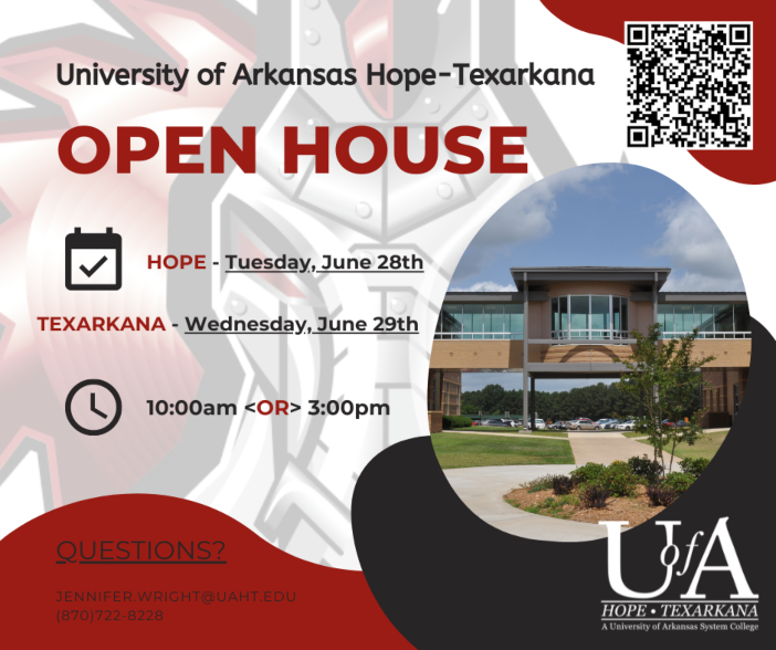 The University of Arkansas Hope-Texarkana will host Open House events on the Hope and Texarkana campuses. Open House is a free event for potential students to explore everything UAHT offers and allow them to ask questions in person. Attendees will have the opportunity to take campus tours, learn about UAHT programs of study, take the Accuplacer test, and learn about financial aid, scholarships, and more. Advisors will also be on hand to register potential students for fall classes.